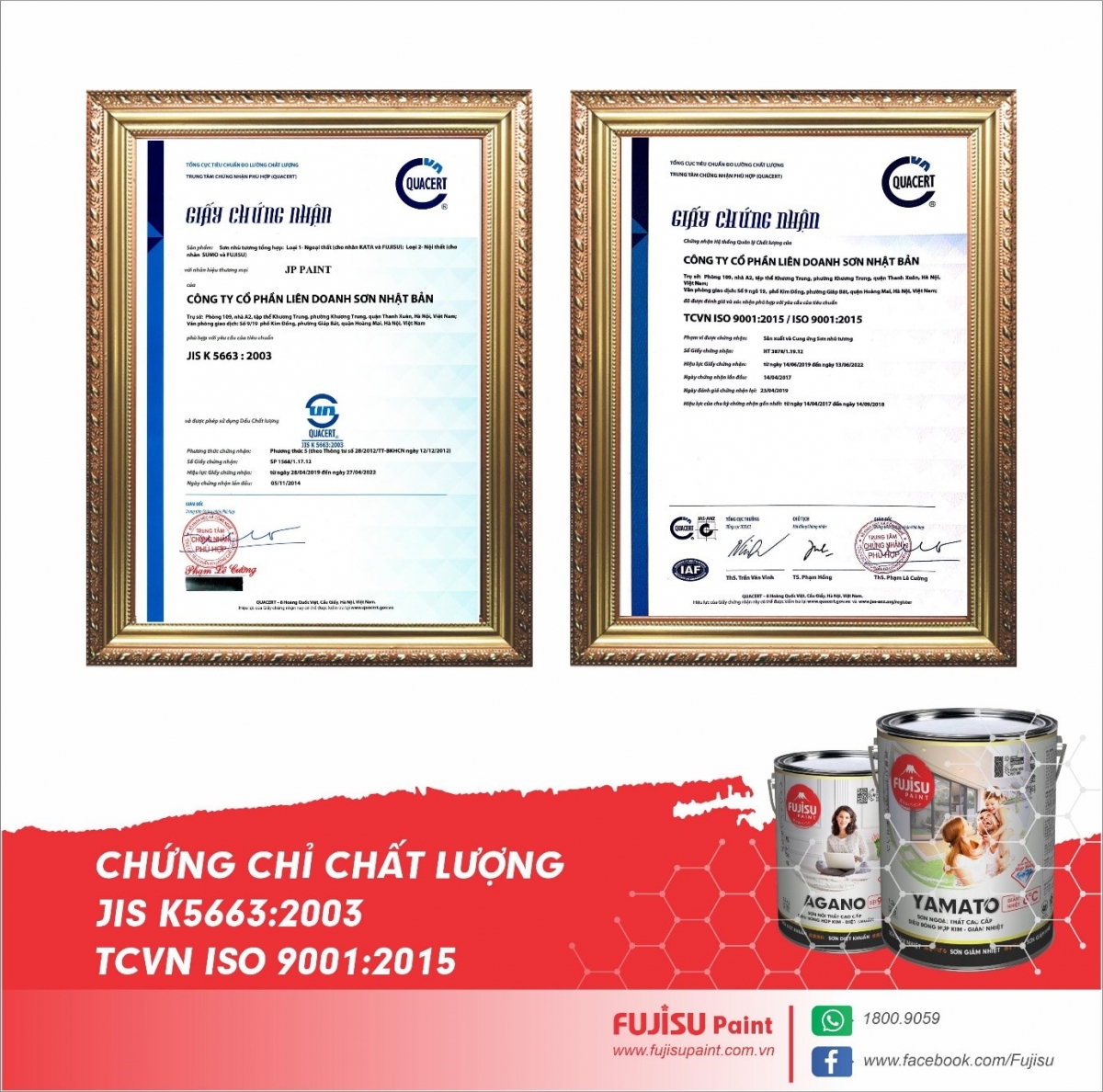 Công ty CPLD sơn Nhật Bản - nhãn hàng Fujisu đã đầu tư trang thiết bị máy móc, dây chuyền sản xuất sơn tự động và hiện đại đạt tiêu chuẩn công nghiệp Nhật Bản JIS K5663 - tiêu chuẩn khắt khe nhất của Nhật Bản và Chứng chỉ tiêu chuẩn quốc tế ISO 9001, tự hảo đưa thương hiệu Việt xứng tầm quốc tế.